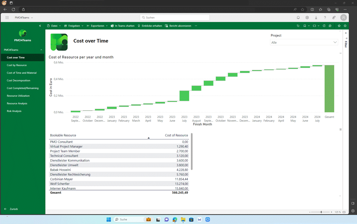 Durch die Integration von Microsoft PowerBI beinhaltet PMO4Teams ein vielseitiges und mächtiges Werkzeug für das Projekt Controlling.