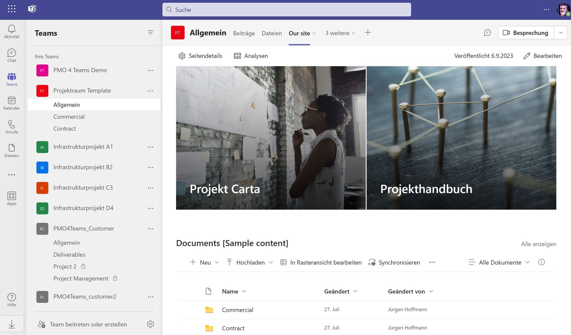 Jede Projektwebsite ist wiederum mit einer übergeordneten Portfoliokommunikationsite (Hubsite) verknüpft, so dass Nachrichten und Neuigkeiten aus den einzelnen Projekten automatisch im Newsfeed der Hubsite erscheinen.