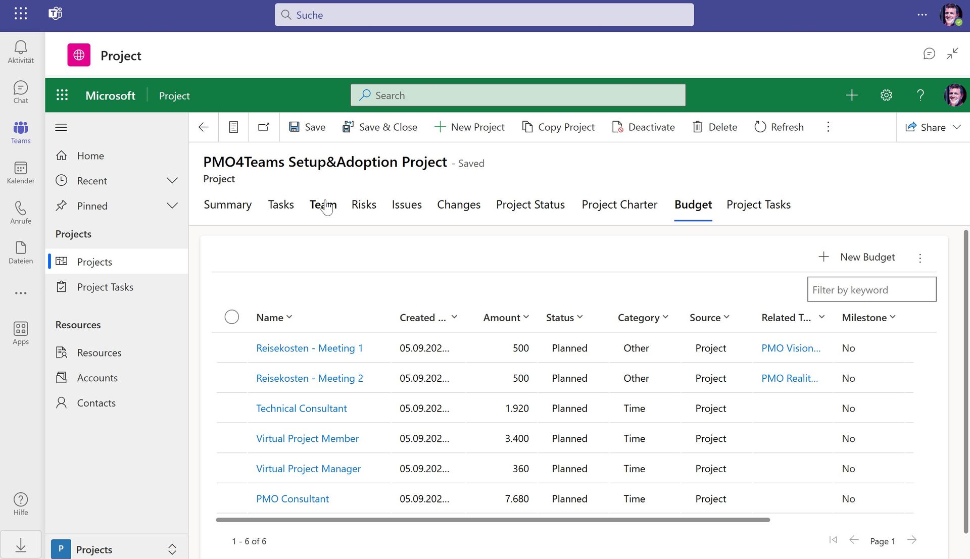 The PMO4Teams solution layer not only allows you to plan and control your project budget, it also makes it easier for you to work on the budget. It calculates the time-related costs based on the planned effort per activity in the project and the respective hourly rate of the assigned resource and automatically enters these into the budget table.