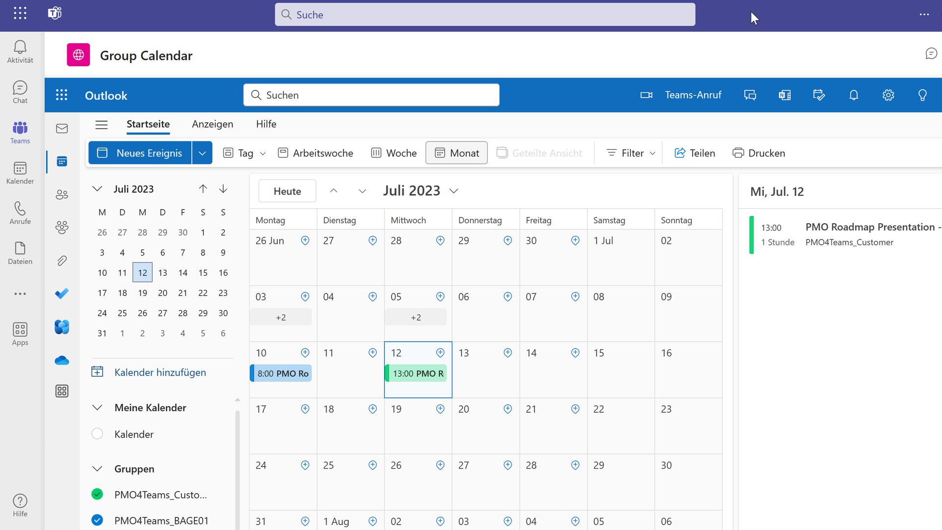 Gruppenkalender in Outlook, mit allen geplanten Besprechungsterminen